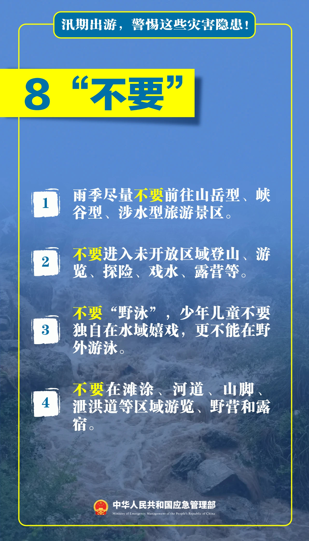 汛期出游,警惕这些灾害隐患!, 安全提示:出行前务必关注目的地天气变化充分了解相关活动相关区域的风险和安全规定严格遵守当地政府及有关部门发布的公告、提示等安全管理规定不要参与涉水高风险项目不要前往未开发开放、不具备安全条件的河床、网红点、泄洪区等危险区域游玩、徒步或露营外出游玩时一定要远离野外危险水域在未经开发的水域进行垂钓、野泳、潜水、游船等休闲娱乐同样非常危险汛期出游哪些风险隐患要警惕?