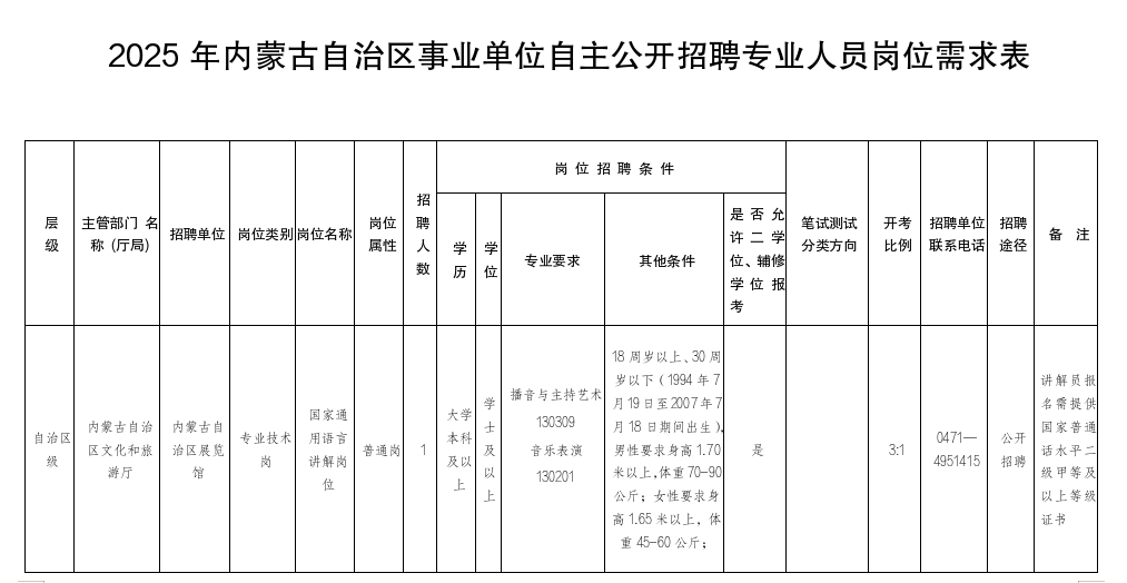 (5)具有大学本科及以上(含)学历、学位(具体以《2025年内蒙古自治区事业单位公开招聘工作人员岗位需求表》为准),以及国家普通话水平二级甲等及以上等级证书;