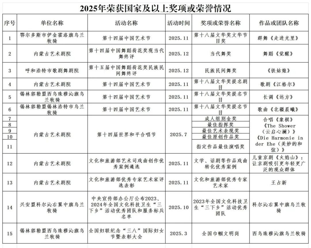 国家级奖项荣誉:精品力作摘金夺银。全区国有文艺院团与文艺工作者深耕艺术创作,在国家级重大活动与评选中捷报频传,彰显了内蒙古文艺创作的硬核实力。从中国艺术节第十八届文华奖到中国舞蹈荷花奖,从世界和平合唱节到全国性荣誉表彰,多个作品与团队脱颖而出,成为内蒙古文化艺术事业的亮丽名片。